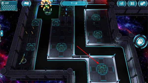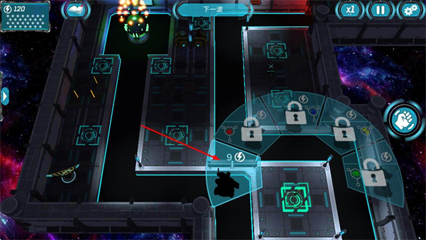 1、进入科幻塔防游戏界面,点击场地中的指定装置位置,调出可部署的防御单位选项。