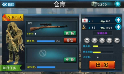 2、点击仓库页面下方的更换即可购买新的武器和装备,点击出发进入;
