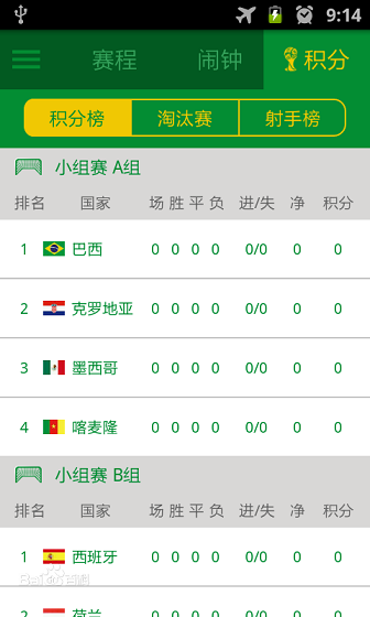 世界杯神器”是一款另类的闹钟软件。因为它结合了世界杯的题材,所以看起来就没那么像闹钟了。诚然,当我们打开该软件的时 候,第一个映入眼帘的画面便是32强的对阵时间表,同时,我们也可以在“积分”的栏目下查阅更为详细的小组积分以及淘汰赛阶段的赛程安排。