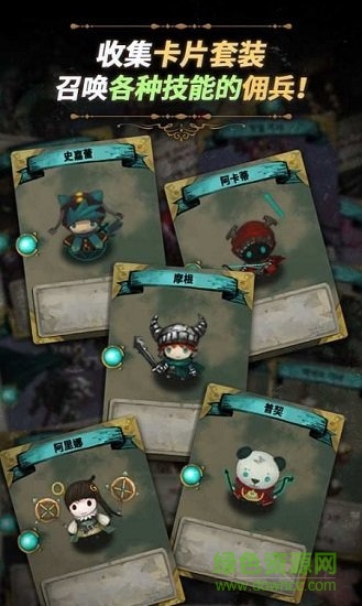 挑战副本收集卡片,完成套装, 就可获得各种队伍佣兵。 每佣兵有不同的技能,可组合各种队伍。 '- 在‘恶梦城堡’