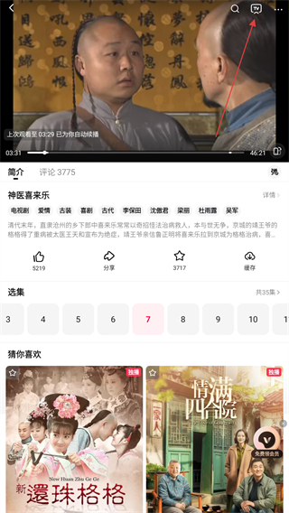 3、在播放的页面内,点击右上方TV的图标即可开始投屏。