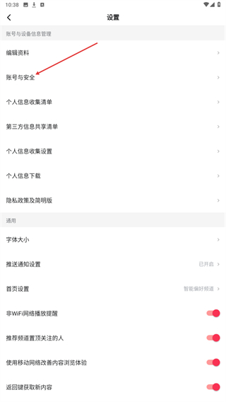 3、在设置页面里,点击账号与安全选项,进入账号安全相关的配置界面。