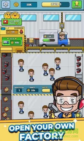 一款以工厂模拟经营为主的放置类的游戏,在这里你能够雇佣工人进行挑战,进行工作站的工作,能够来升级工作站哦,招募更多的工人,提高工作效率。超多精彩丰富的内容玩法,玩家们进入到这个工厂里面赚钱,慢慢不断赚取金币,积累掌握更多的技能,以便于接收大量的订单,赚取更多的金币来扩展自己的经营规模,操作非常的简单,只需要进行收获点击即可,卡通的画面风格,在闲暇之余打发时间真的是再适合不过了。