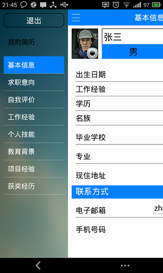 掌上简历是一款移动端的简历制作软件。软件功能强大,无需网络即可免费制作各种简历。用户只需要通过简单的几步,即可制作出一份完美的个人简历;并且软件还支持简历下载。你可以去"智联招聘","前程无忧"上下载简历。找工作的朋友,赶快下载体验吧!