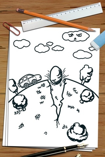 只此一关游戏开始的提示页面。上面4个菜单栏就是帮助系统了。再看看游戏操作区域。整个游戏从开始到结束,关卡场景都没有改变,小车、树木、石头、终点,始终如一,只此一关。挑战每一个关卡,在终点的上面都有一句话,来引导玩家获得通关的关键点。从引导的提示出找出过关秘诀,让小车安全到达终点就可以了。
