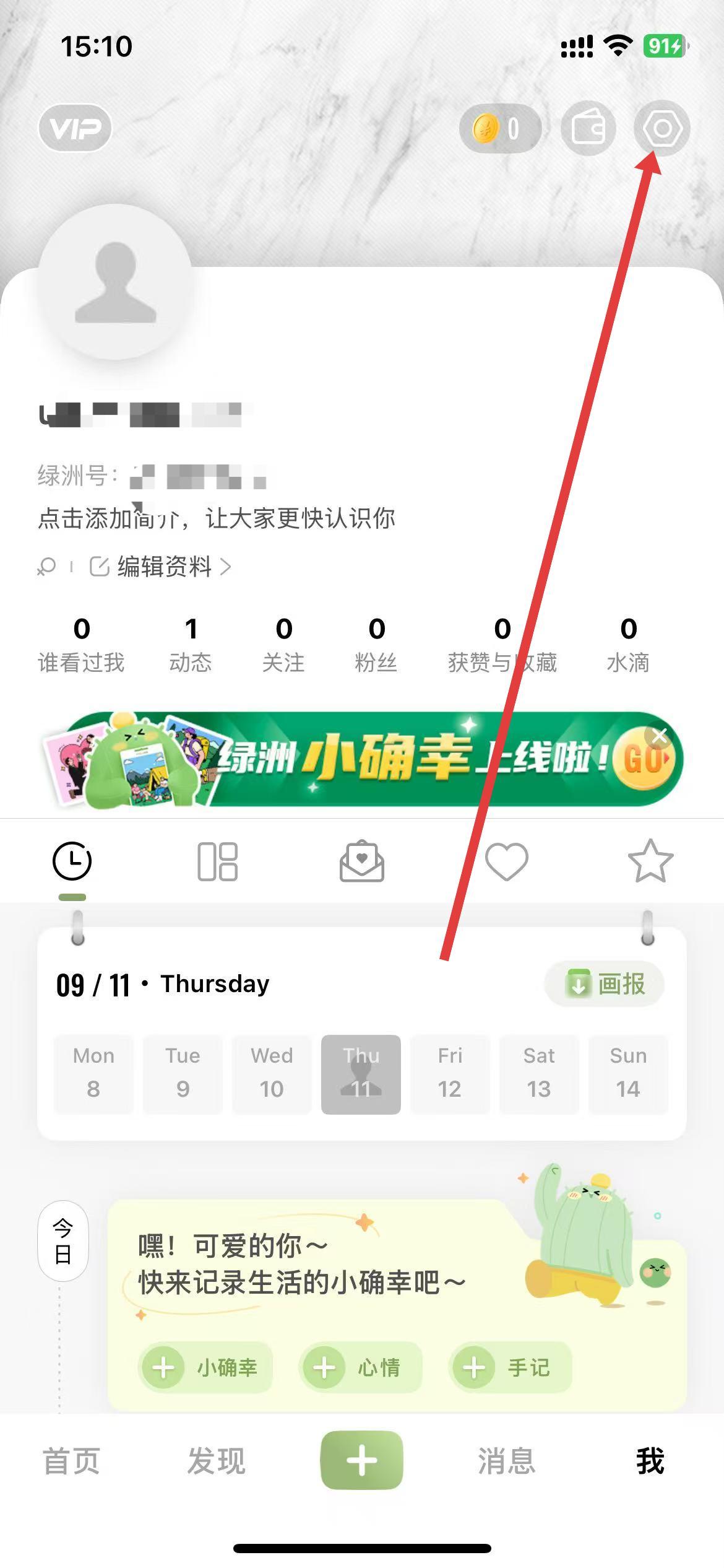 1、点击底部我进入个人主页,再点击右上角设置图标。
