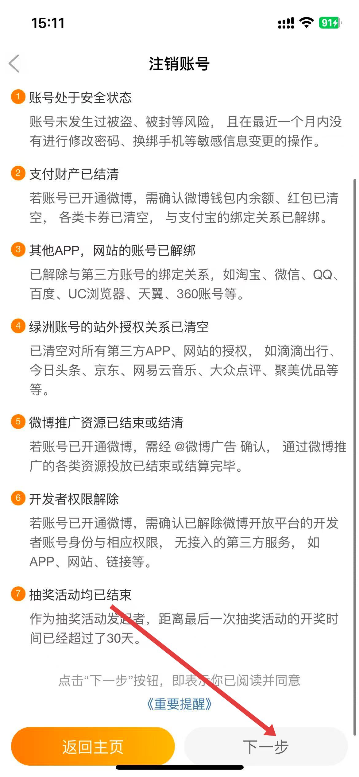 4、仔细查看注销条件,满足后点击下一步,按提示完成注销操作。