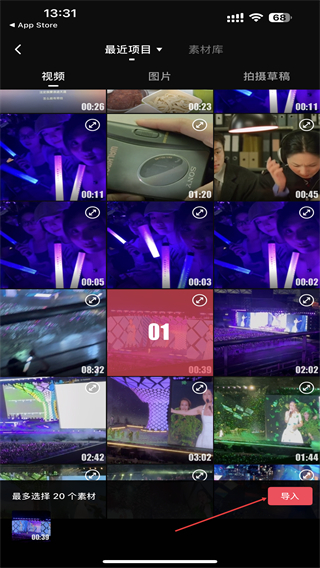 2、在选择视频的页面内,选择后点击导入的按钮。