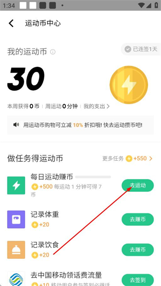 3、选择任务,完成对应任务即可获得运动币。