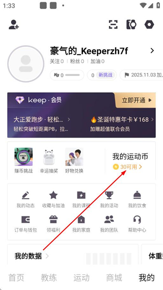 2、进入“我的”页面后,点击我的运动币选项进入运动币中心。