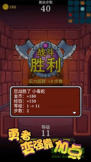 一款非常简单而且又有深度的游戏。每个玩家饰演一名勇者爬塔闯关冒险,每次升级可以获得升级点数奖励,可以提高自己的生命值、攻击力、防御力、速度以及幸运值,在不断冒险获得更多超强的装备去挑战魔王吧!