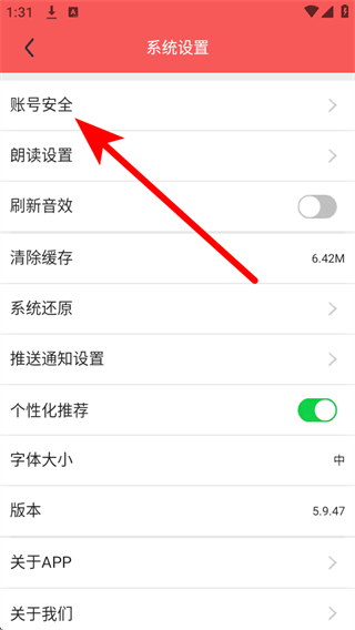 3、在系统设置界面里,点击账号安全选项,进入账号安全页面。