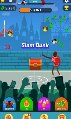 使用助推器享受闲置扣篮的主人作为空闲游戏:自动投掷,X2伤害,球雨,X2现金。