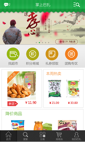 掌上巴扎同城电商服务软件,是一个子女对父母表达关爱的服务平台。掌上巴扎从商品、事件、服务、表达四个方面开展平台“孝心服务”,以优质的服务理念,为市民提供放心的优质产品及贴心服务!欢迎下载使用!