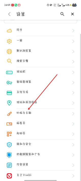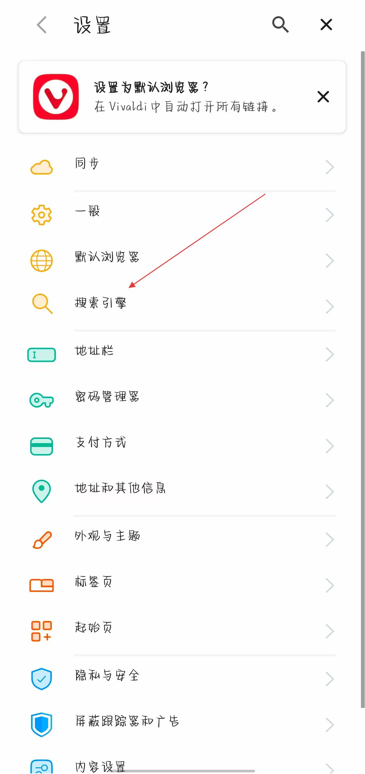 3、在设置界面里,找到搜索引擎选项并点击,进入搜索引擎设置页面。