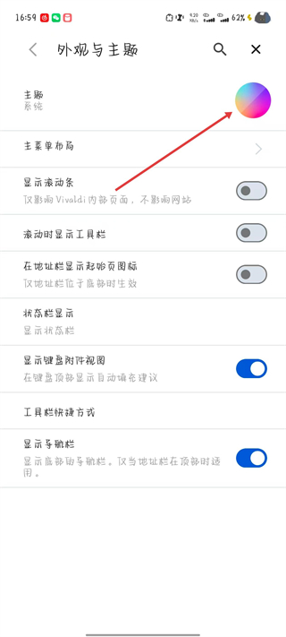 4、在外观与主题页面,点击主题右侧的彩色圆形图标。
