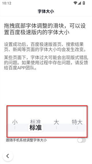 4、在字体大小界面,选择小、标准、大、特大中的选项,即可调整百度极速版内的字体显示大小。
