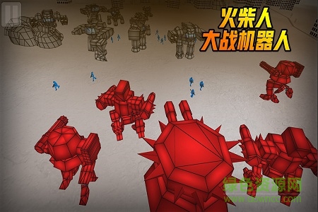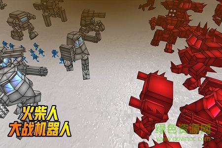《火柴人大战机器人》是一款3D机甲战争模拟游戏。玩家通过排列布局你的火柴人战士,坦克,机甲机器人来组建你的军队,战胜你的敌对的机甲火柴人军队。绿色资源网玩家在游戏里要帮助火柴人大战机器人。有各式各样的武器装备可以选择,部署火柴人军队,与敌军展开一场激烈的厮杀。每一个关卡的挑战我们都必须胜利,这场战斗只能成功不能失败。打败机器人,取得游戏的胜利。