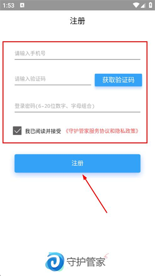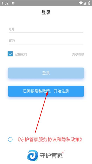 1、打开守护管家APP,在登录页面点击已阅读隐私政策,开始注册。