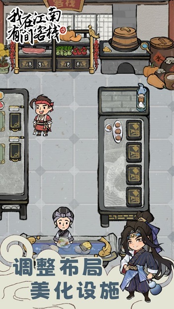 我在江南有间客栈是一款古风风格的模拟经营游戏,在里面经营着一家小客栈,玩家化身为掌柜在里面经营,可以自由调整客栈的布局,让更多的顾客在里面购买物品你和美食,研发全新的菜品不断扩大自己的市场。