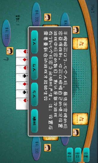 1.干瞪眼游戏用的一副扑克牌,共54张(3个人以上需要108张)牌,每桌需要2-6名玩家才能游戏。
