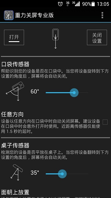 检测您的设备是否平放在桌子上,当您将设备翻转到下方设置的角度后,屏幕将会自动关闭,另外此功能也能像上面描述的那样避免无意识的按键操作