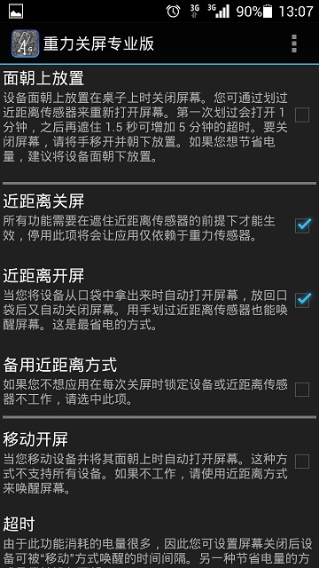 重力关屏能通过设备的重力传感器自动关闭/打开屏幕,让您摆脱频繁按电源键的苦恼,特别是在仅仅想看设备几秒钟的情况,能节省很多时间。当您将设备放入口袋中或面朝下放到桌子上时,屏幕将会自动关闭;再放回口袋或翻转朝上时又会自动关闭。不需要按任何键就能对设备进行操作。