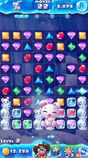 不得不夸一下本作的游戏画面,相当精致,为了凸显冰天雪地的严寒,背景主要以蓝白色为主作为铺垫,而满屏幕充斥着闪闪发光的彩色宝石,用高光点缀的非常闪耀,还有各种萌物不断出现,消除时光芒四射的特效,简直是亮瞎眼的节奏。