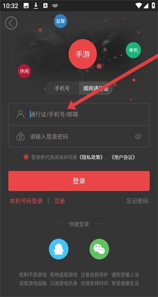4、在顺网通行证登录界面输入账号和登录密码后,点击“登录”,完成账号登录操作。