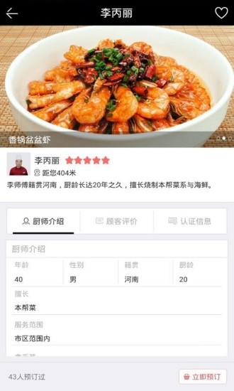 4、所有的厨师均经过严格实名验证、试菜方可进入平台,界面可看到厨师的详细信息,包括年龄、籍贯、擅长菜系、服务时间、服务范围以及顾客评价等