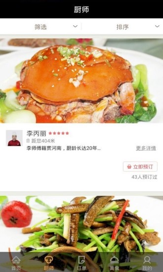 2. 厨师和美食分开呈现,增加了筛选和排序功能,寻找厨师和美食的过程变得更快捷~