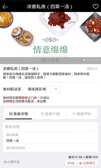 3、可根据地理位置就近选择星级大厨为您服务,也可根据自己的口味来选择合适的大厨,有4菜、6菜、8菜等多个套餐可选,操作非常简单