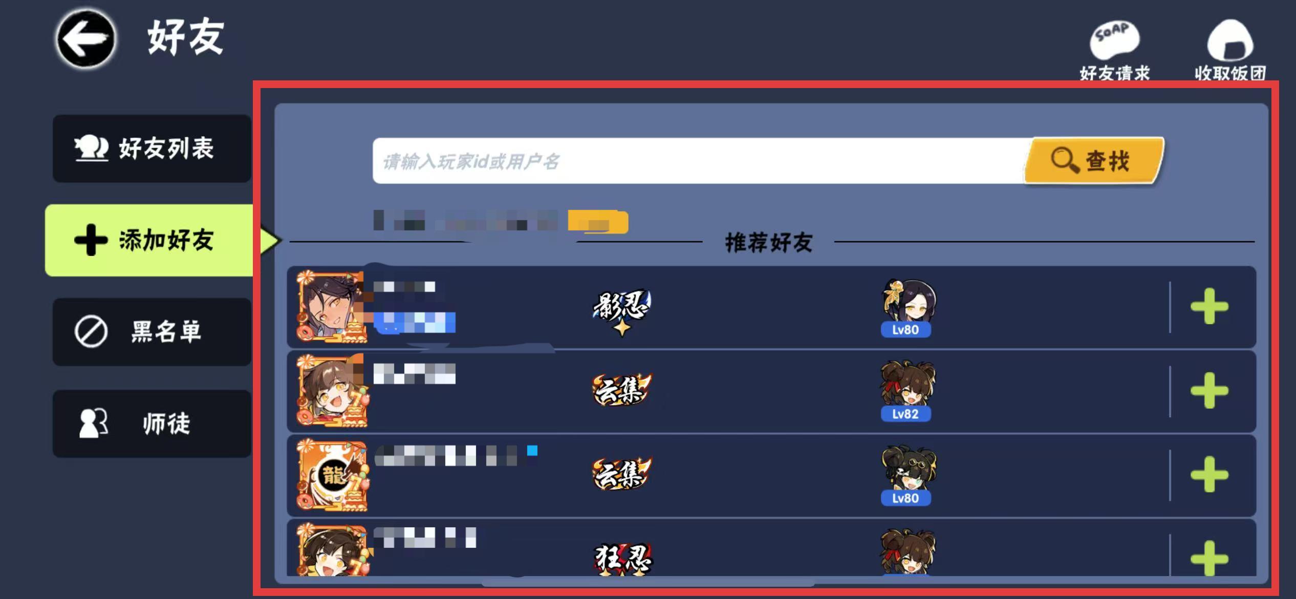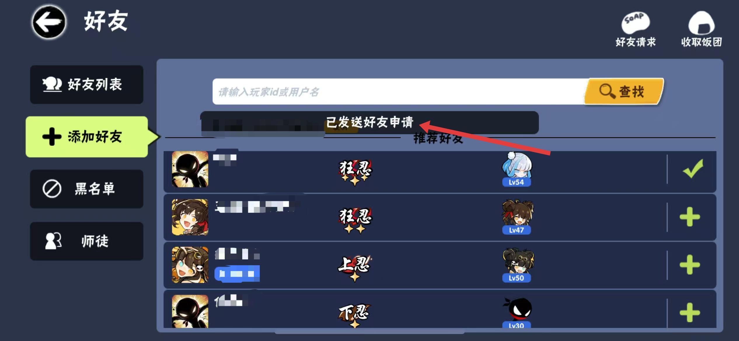 4、点击玩家头像右侧的+号按钮,即可向对方发送好友申请,对方同意后即添加成功。