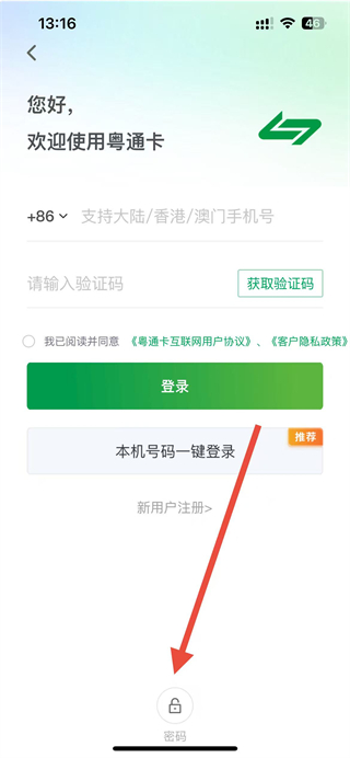 3、在登录界面底部,点击密码选项,切换至密码登录模式。