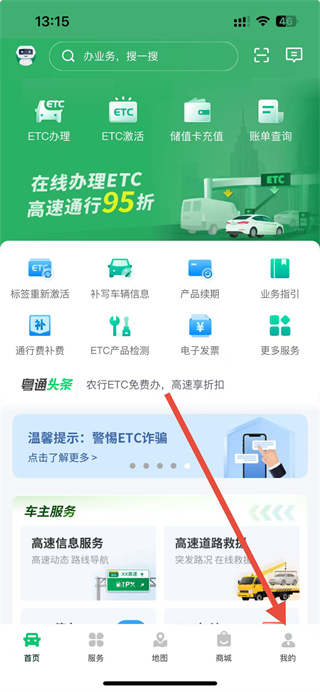 1、进入粤通卡主界面后,点击底部导航栏最右侧的我的选项。