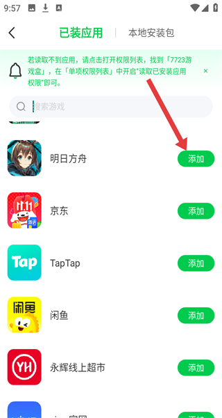 4、在已装应用页面点击对应游戏的“添加”按钮,完成免ROOT添加游戏操作。