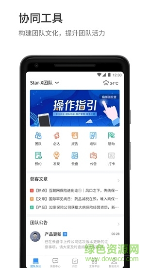 基于保险团队公司化运营理念的智慧协作工具。清晰的团队结构,便捷的团队月历,一键发布培训、招募、必达、公告,团队资讯快速上通下达。