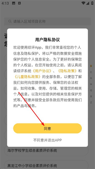 1、打开综评学生版app,在用户隐私协议页面点击同意。