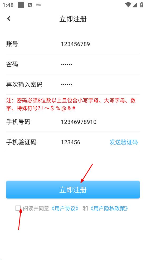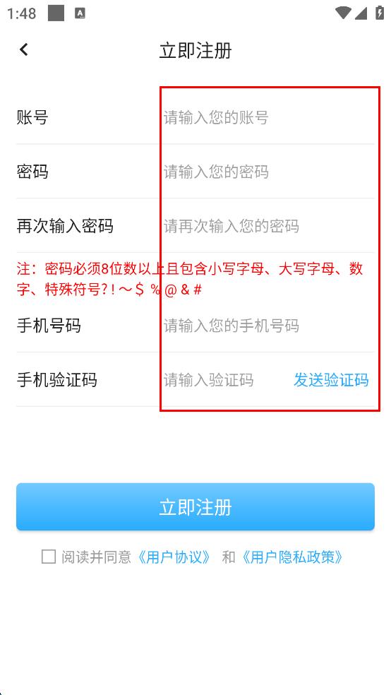 4、勾选阅读并同意用户协议和用户隐私政策,点击“立即注册”,完成注册后可返回登录界面进行登录。