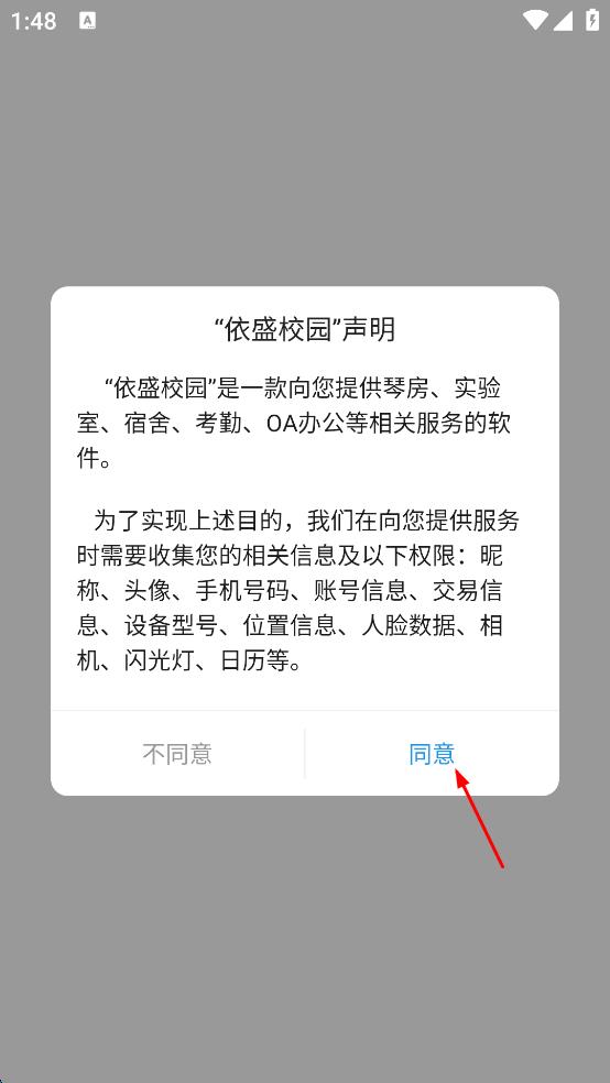1、打开“依盛校园”APP,弹出“依盛校园”声明,仔细阅读后点击“同意”,进入登录界面。