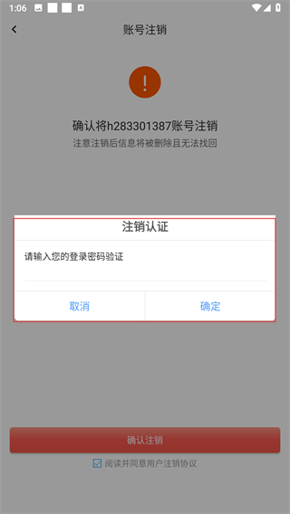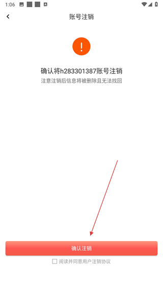 3、勾选阅读并同意用户注销协议,点击确认注销按钮。