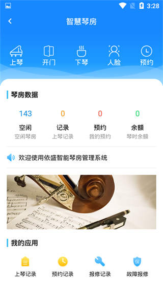 依盛校园安卓手机版是适配安装了依盛琴房管理系统的学校与培训机构的实用琴房管理工具,能让用户实时查看琴房使用状态并轻松预约空闲琴房,预约成功后可通过扫码完成开门与上下琴操作,还能清晰查询上琴、预约、报修等各类记录以及琴时余额,搭配简洁操作界面,让琴房使用和管理都格外便捷,适合有练琴需求的师生使用。