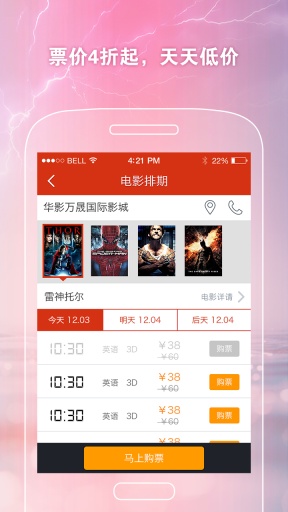 支持在线选座,自助取票,从此告别排队!票价低至4折起,价格更加优惠。