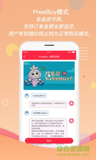 全品类电商商城,承诺正品,假一赔十;全部商品支持0成本购买,即FreeBuy模式;新用户和信用卡用户享受新品免费体验。