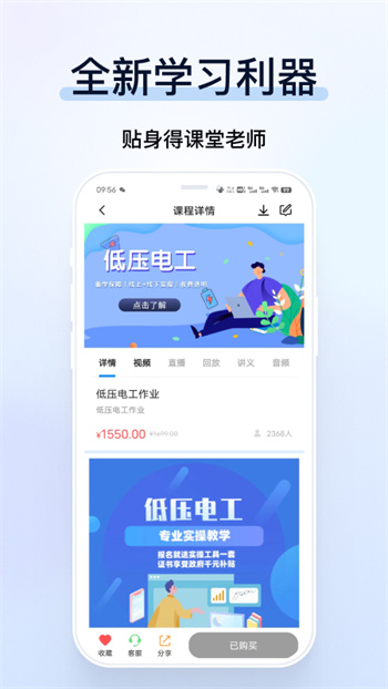 全方位备考辅导教学App,涵盖职业资格、安全管理、学历、特种设备等多种考试及专业课程,名师课堂直播同步教学,海量试题免费做,为学员用户提供及时全面的内容资讯,免费提供大量优质的公益培训,让天下没有难拿的证!