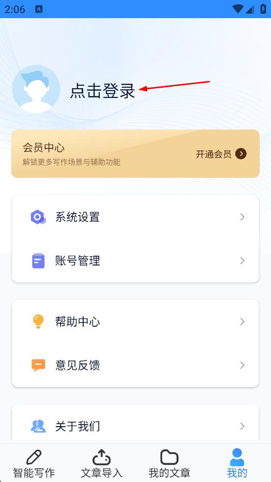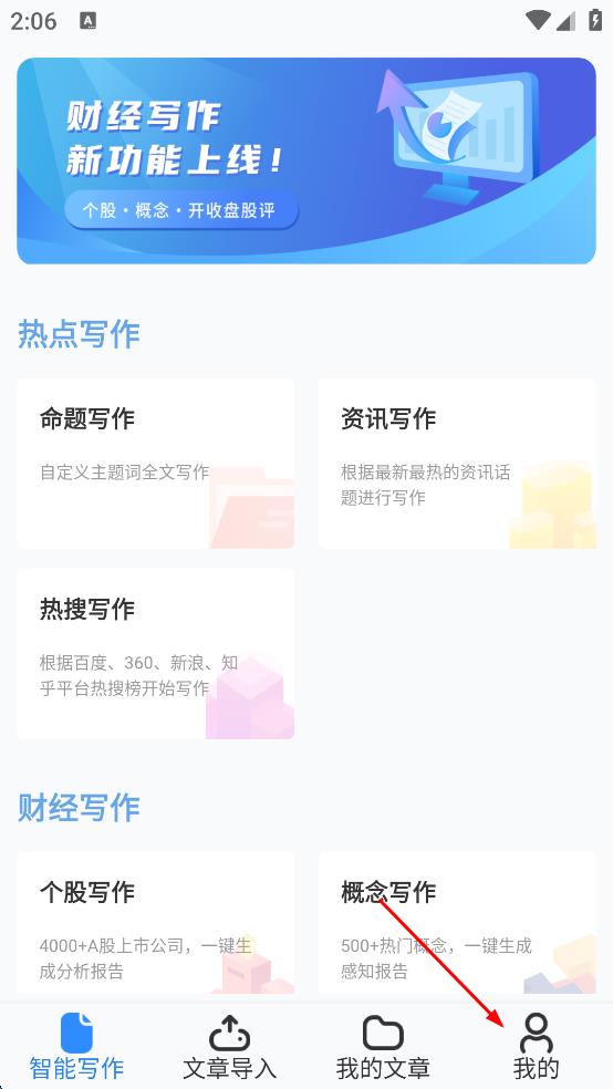 1、打开写作类APP,进入首页后,点击页面右下角的“我的”按钮。