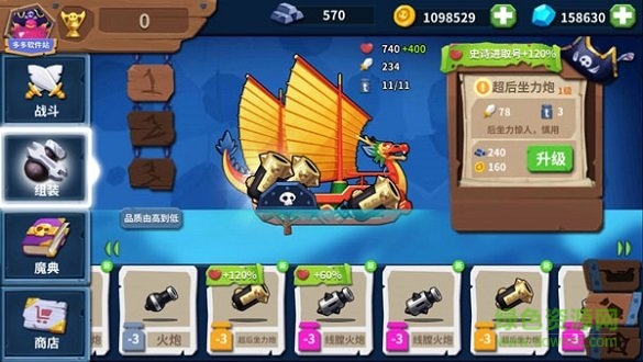 组装主要分为三大要素:船舰的选择、炮弹武器的填装和角度调整以及加速装置,三者相辅相成,同时着三者也都可以利用矿石和金币进行升级,大大的能够增强你海盗船的实力。