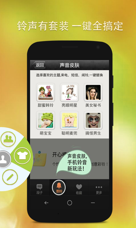 酷音秀秀是一款综合性的手机铃声软件。软件功能强大,集热门冷笑话、搞笑段子推荐、智能语音DIY个性手机彩铃、手机声音皮肤、微博分享功能与一身。软件通过模仿"林志玲"、"蜡笔小新"等多位主播为您讲语音笑话、说段子,让你听铃声、听笑话两不误。