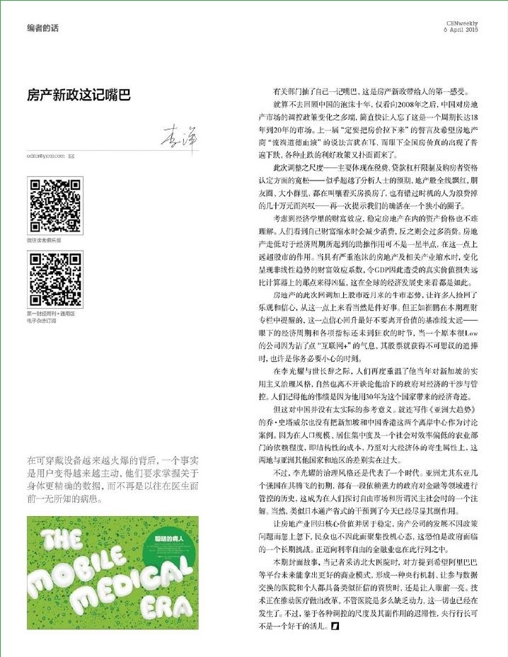 第一财经周刊2015年第12期pdf高清版,小编推荐《小发明家造访白宫》导读:可以治打嗝的棒棒糖,给小狗设计的3d打印义肢、人工脊椎、检测血液酒精含量的智能手环、阿兹海默症病人定位器、新乳腺癌预测模型……3月23日,100多名来自34个科学团队的美国青少年将自己的发明带到了白宫,参加一年一度的白宫科学展博览会。今年,被邀请到白宫的35个研究项目涉及清洁能源、污水处理、生物工程、机器人、太空技术等多个领域。......