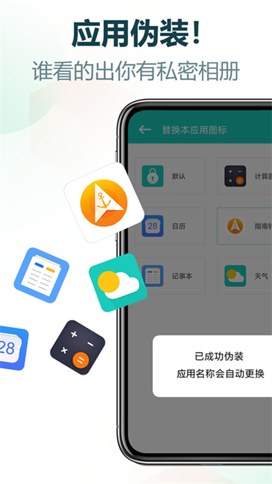 隐藏应用图标,除了你没有人知道应用入口。您可以输入网址http://i.secbox.co(推荐此方式,建议收藏到浏览器书签)或者拨打#1234唤起应用,让您的隐私穿上隐形衣。